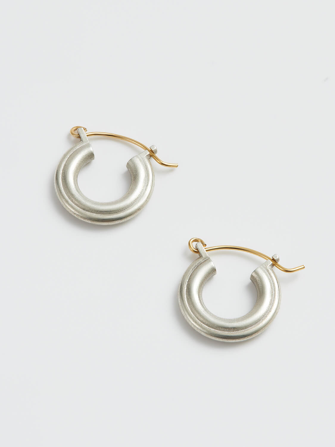 If your preference for earrings is the more demure variety, these mini hoops are for you. Cast in sterling silver with solid 14k gold ear wires, they measure 5/8" (17mm) in diameter and are a quiet addition to your look. They can be accented with charms or worn on their own, offering versatility and elegance to your outfit. Pair them with the Waxing Gibbous Pendant.